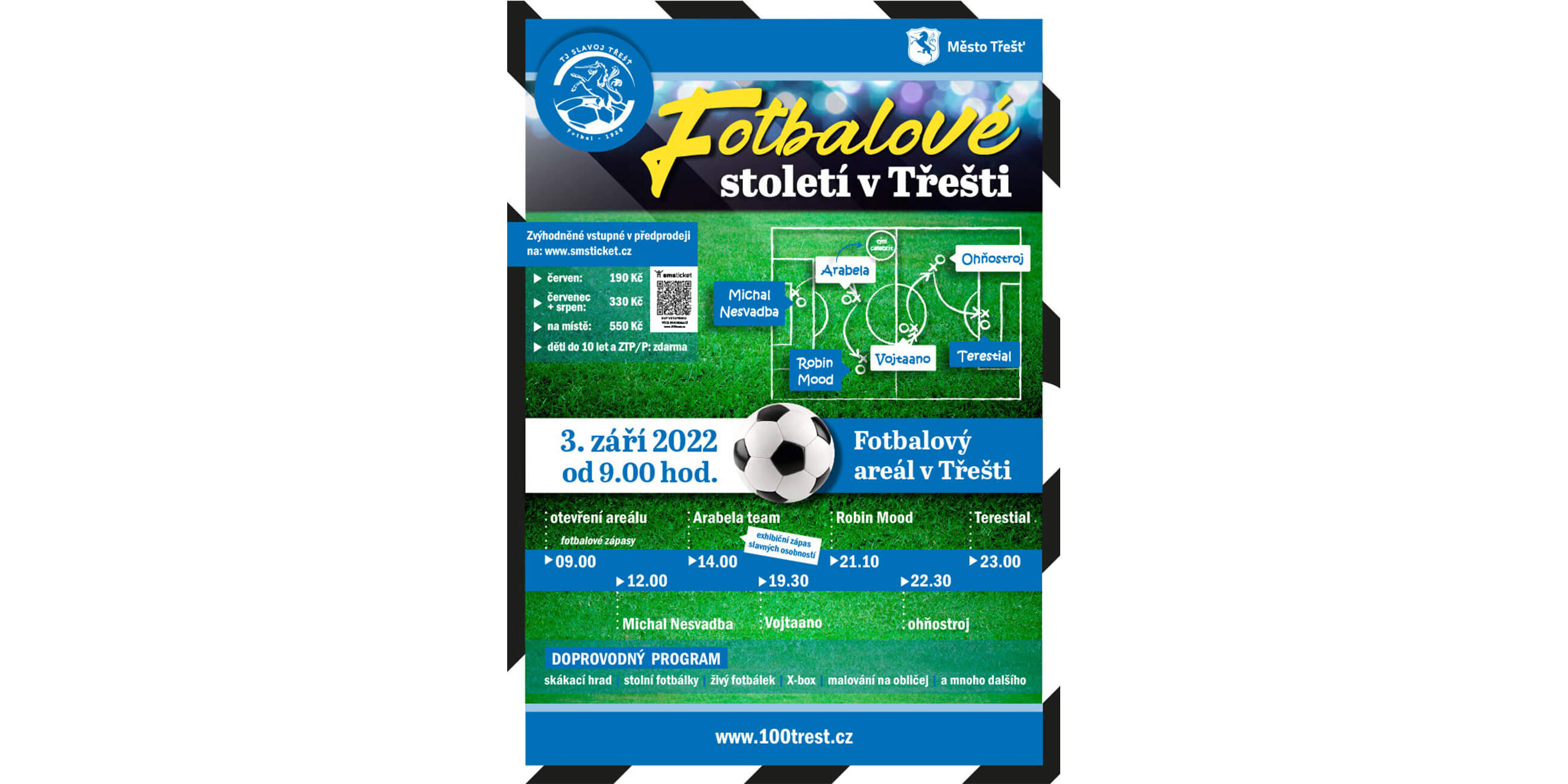 Fotbalu v Třešti je již 100 let! Pojďte s námi oslavit první společné století na fotbalovém hřišti! Čeká Vás zápas hvězdného Arabela týmu, vystoupí také Michal Nesvadba, Vojtaano, Robin Mood a Terestial!