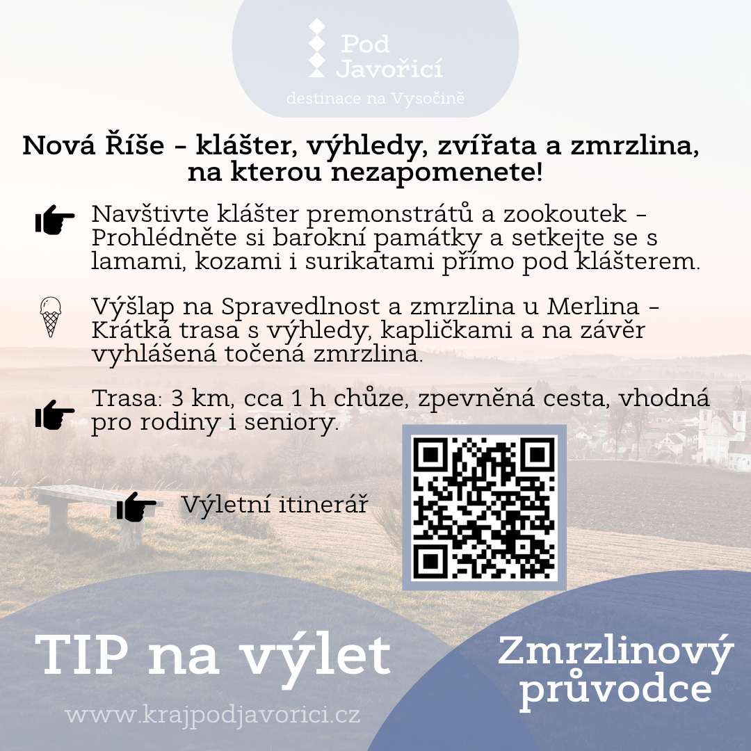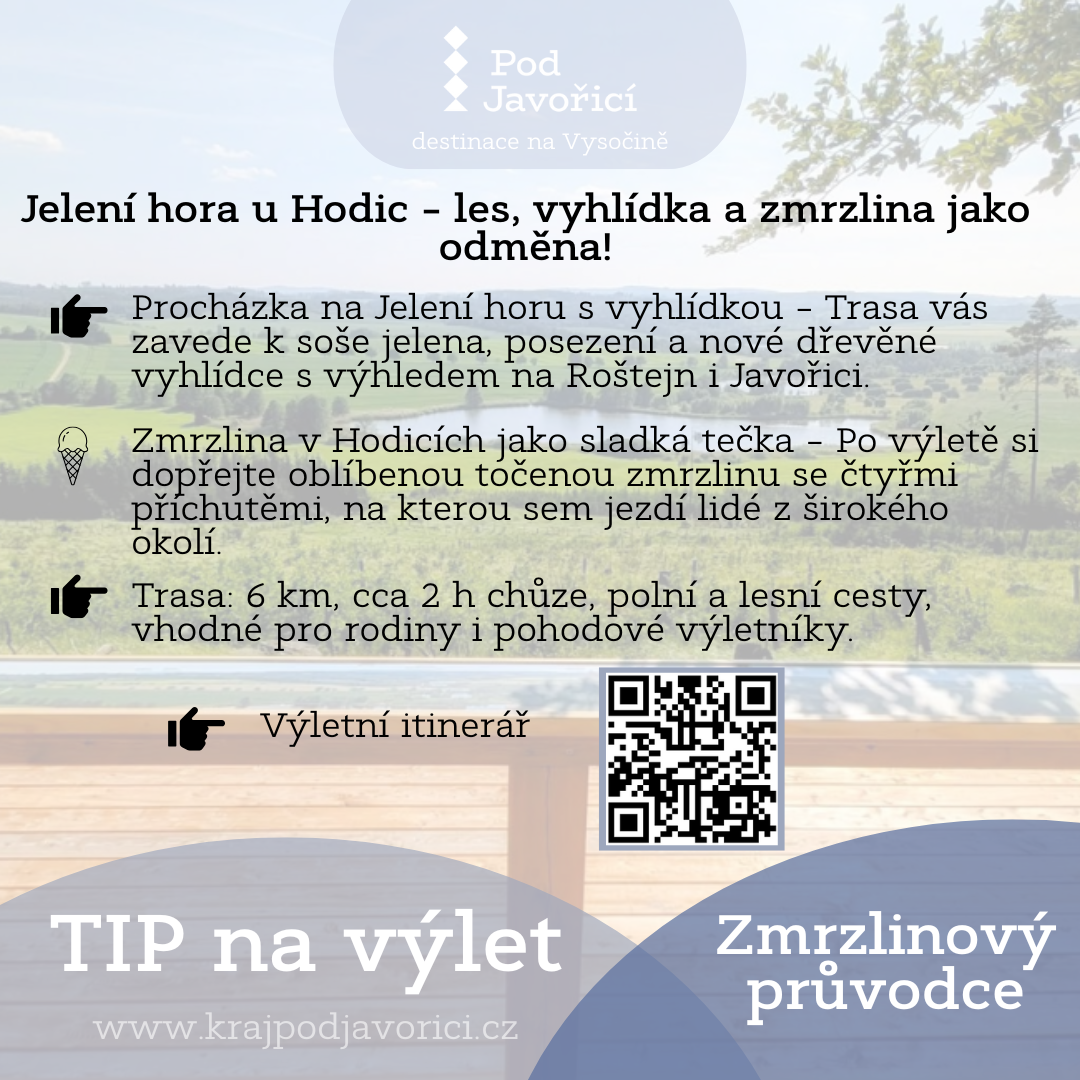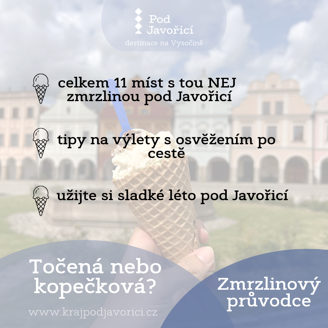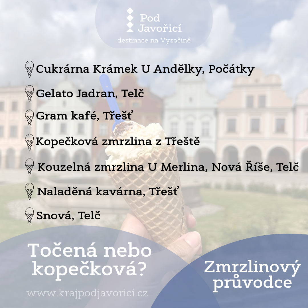 Pokud hledáte osvěžení během letních výletů, máme pro vás sladký tip – Zmrzlinový průvodce Pod Javořicí vás zavede do těch nejlepších podniků v regionu, kde zmrzlina chutná jako odměna. V Telči, Třešti, Nové Říši nebo Počátkách si můžete vychutnat jak poctivou kopečkovou, tak i vyhlášenou točenou zmrzlinu. Ať už vyrážíte s rodinou, přáteli nebo sami, spojte objevování historických měst a přírody s malým zmrzlinovým dobrodružstvím – protože nejlepší výlety končí sladkou tečkou.